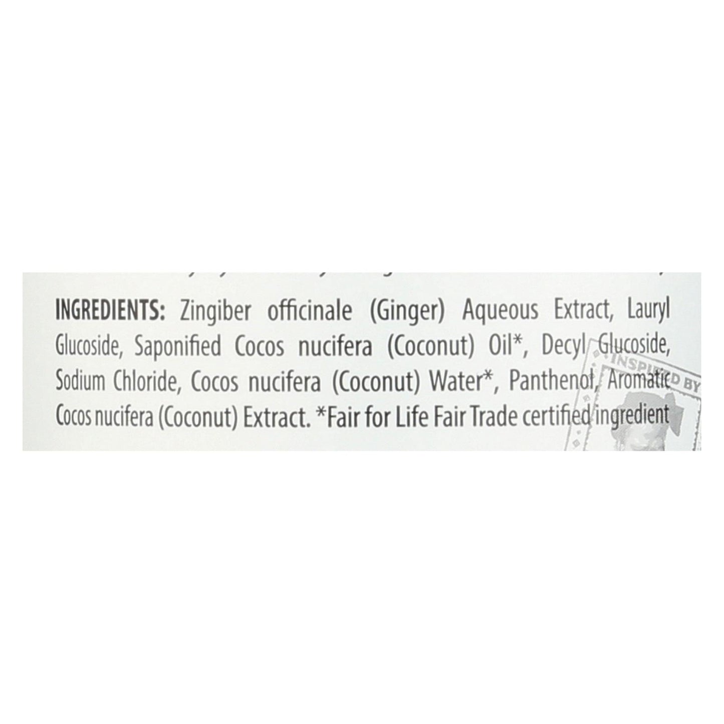ingredients : zingiber officinale;ginger;aqueous extract;lauryl glucoside;saponified cocos nucifera;coconut;oil;decyl glucoside;sodium chloride;cocos nucifera;water;panthenol;extract