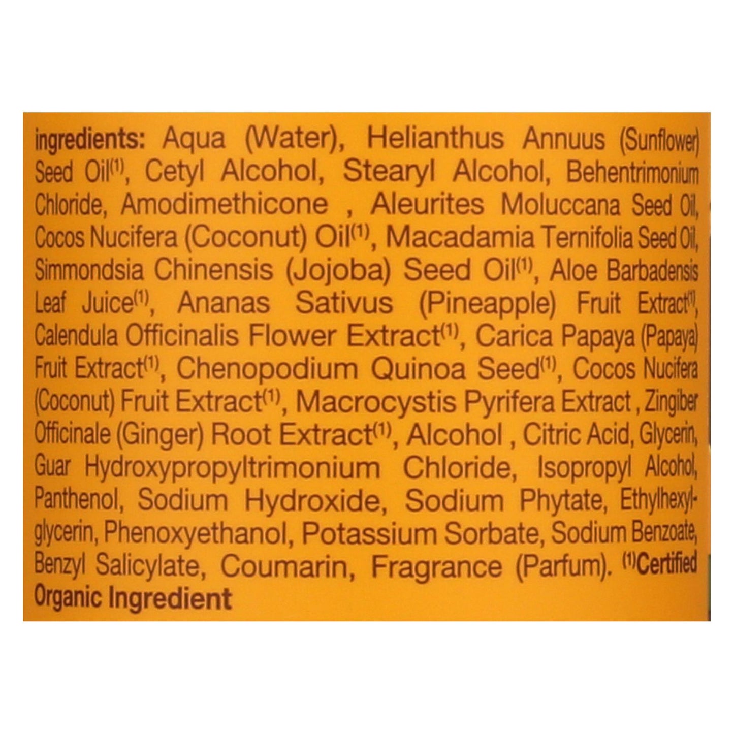 ingredients : water;aqua;helianthus annuus;sunflower;seed oil⁽¹⁾;cetyl alcohol;stearyl alcohol;behentrimonium chloride;amodimethicone;aleurites moluccana seed oil;cocos nucifera;coconut;oil⁽¹⁾;macadamia ternifolia seed oil;simmondsia chinensis;jojoba;aloe barbadensis leaf juice⁽¹⁾;ananas sativus;pineapple;fruit extract⁽¹⁾;calendula officinalis flower extract⁽¹⁾;carica papaya;papaya;chenopodium quinoa seed⁽¹⁾;macrocystis pyrifera extract;zingiber officinale;ginger;root extract⁽¹⁾;alcohol;citric acid;glycerin;g
