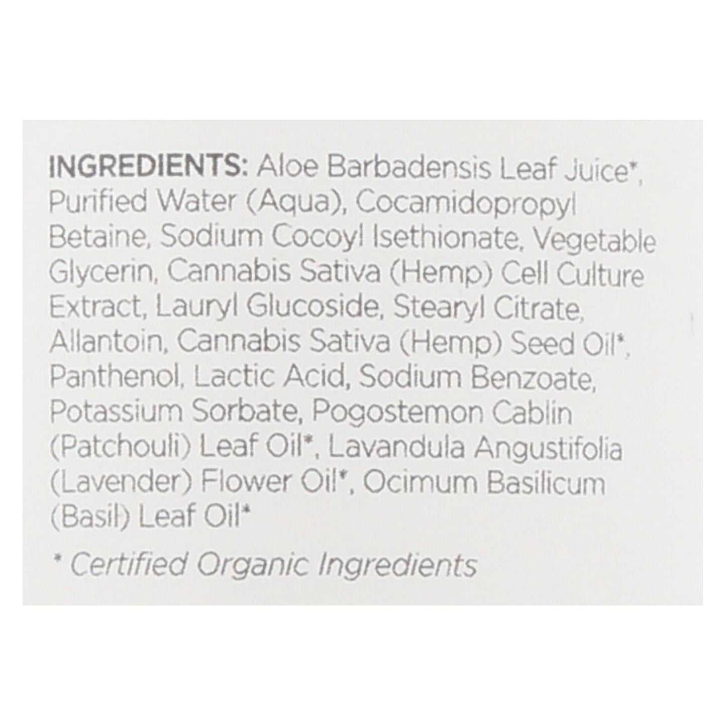 ingredients : aloe barbadensis leaf juice;purified water;aqua;cocamidopropyl betaine;sodium cocoyl isethionate;vegetable glycerin;cannabis sativa;hemp;cell culture extract;lauryl glucoside;stearyl citrate;allantoin;seed oil;panthenol;lactic acid;sodium benzoate;potassium sorbate;pogostemon cablin;patchouli;leaf oil;lavandula angustifolia;lavender;flower oil;ocimum basilicum;basil
