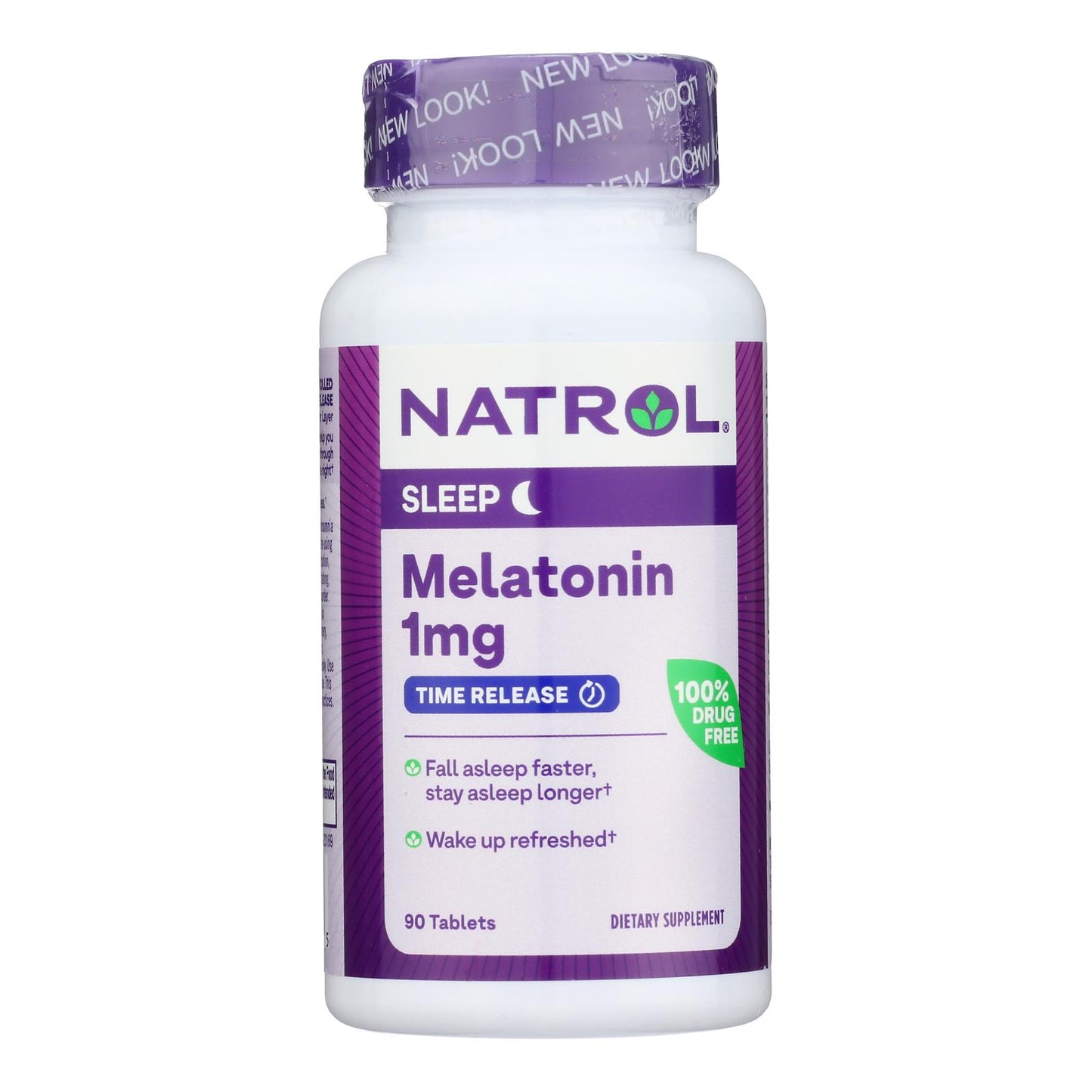 NATROL 1 MG. TIME RELEASE MELATONIN HELPS YOU FALL ASLEEP FASTER AND STAY ASLEEP LONGER WITH OUR TWO-LAYER TIME RELEASE TABLETS. OUR PRESERVATIVE-FREE SLEEP AID IS 100% DRUG-FREE AND HELPS ESTABLISH NORMAL SLEEP PATTERNS. OUR SUPPLEMENT ALSO CONTAINS VITAMIN B-6. EACH BOTTLE OF MELATONIN CONTAINS 90 VEGETARIAN TABLETS.
