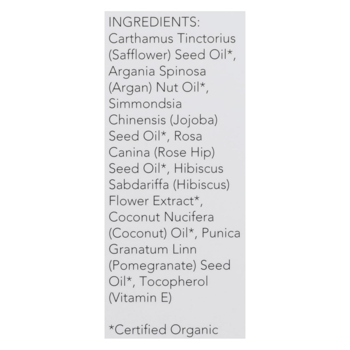 ingredients : carthamus tinctorius;safflower;seed oil;argania spinosa;argan;nut oil;simmondsia chinensis;jojoba;rosa canina;rose hip;hibiscus sabdariffa;hibiscus;flower extract;coconut nucifera;coconut;oil;punica granatum linn;pomegranate;tocopherol;vitamin e