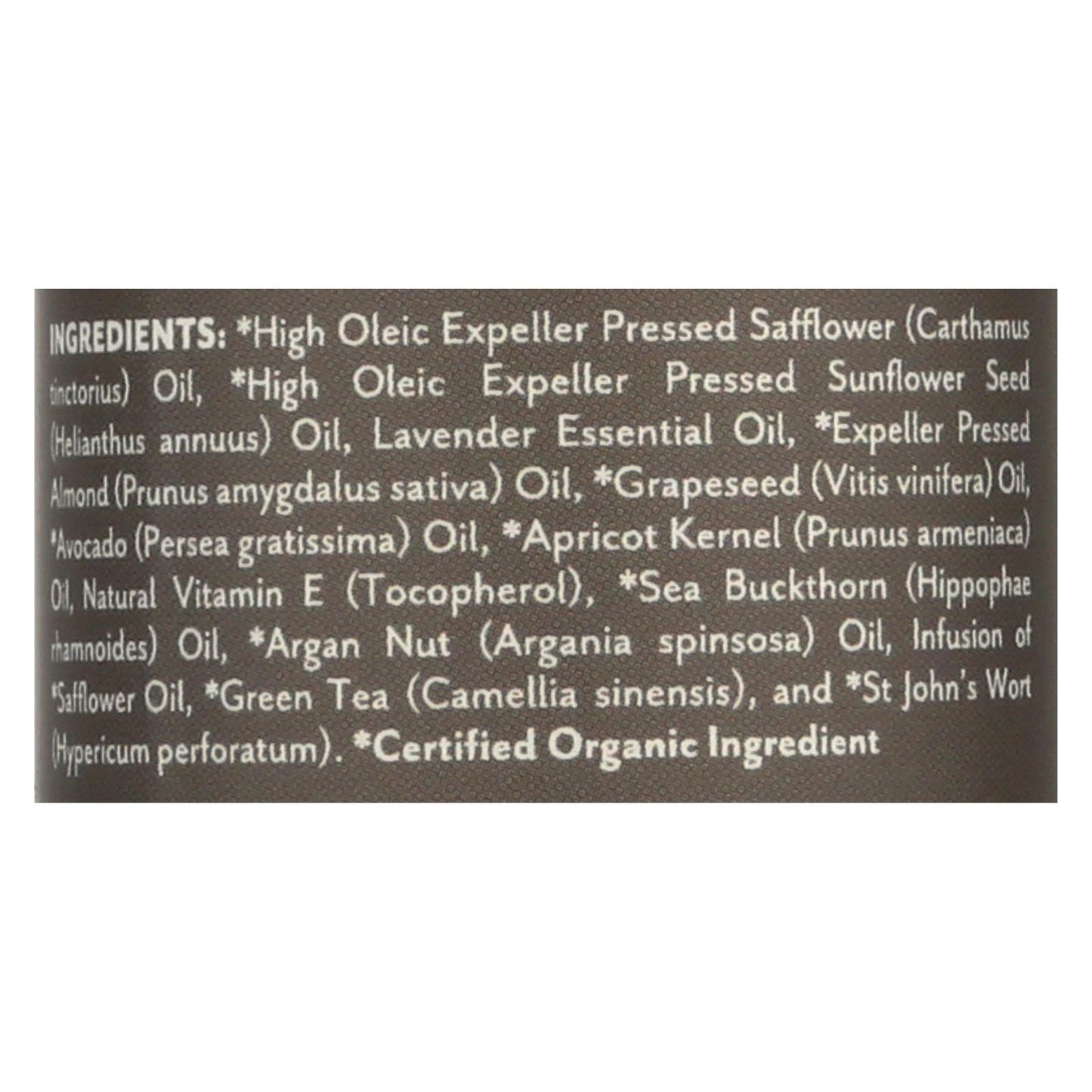 ingredients : high oleic expeller pressed safflower;carthamus tinctorius;oil;high oleic expeller pressed sunflower seed;helianthus annuus;lavender essential oil;expeller pressed almond;prunus amygdalus sativa;grapeseed;vitis vinifera;avocado;persea gratissima;apricot kernel;prunus armeniaca;natural vitamin e;tocopherol;sea buckthorn;hippophae rhamnoides;argan nut;argania spinosa;infusion of *safflower oil;green tea;camellia sinensis;and *st john’s wort;hypericum perforatum