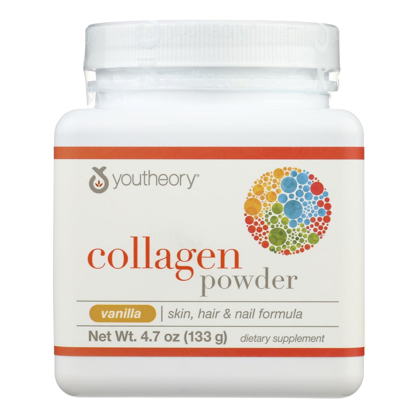 YOUTHEORY DIETARY SUPPLEMENT COLLAGEN POWDER IS A SUPPLEMENTAL SOURCE OF VITAMIN C AND DIETARY PROTEIN IN POWDER FORM. USE IT TO REPLENISH COLLAGEN AND FIGHT THE EFFECTS OF AGING ON YOUR SKIN. THIS GLUTEN-FREE, SOY-FREE AND DAIRY-FREE PRODUCT CONTAINS HYDROLYZED COLLAGEN. ADD ONE ROUNDED SCOOP OF THE POWDER TO WATER OR OTHER LIQUIDS. THERE ARE ABOUT 17 SERVINGS PER 4.7 OZ. BOTTLE. SEE NUTRITION FACTS PANEL FOR ALLERGENS.