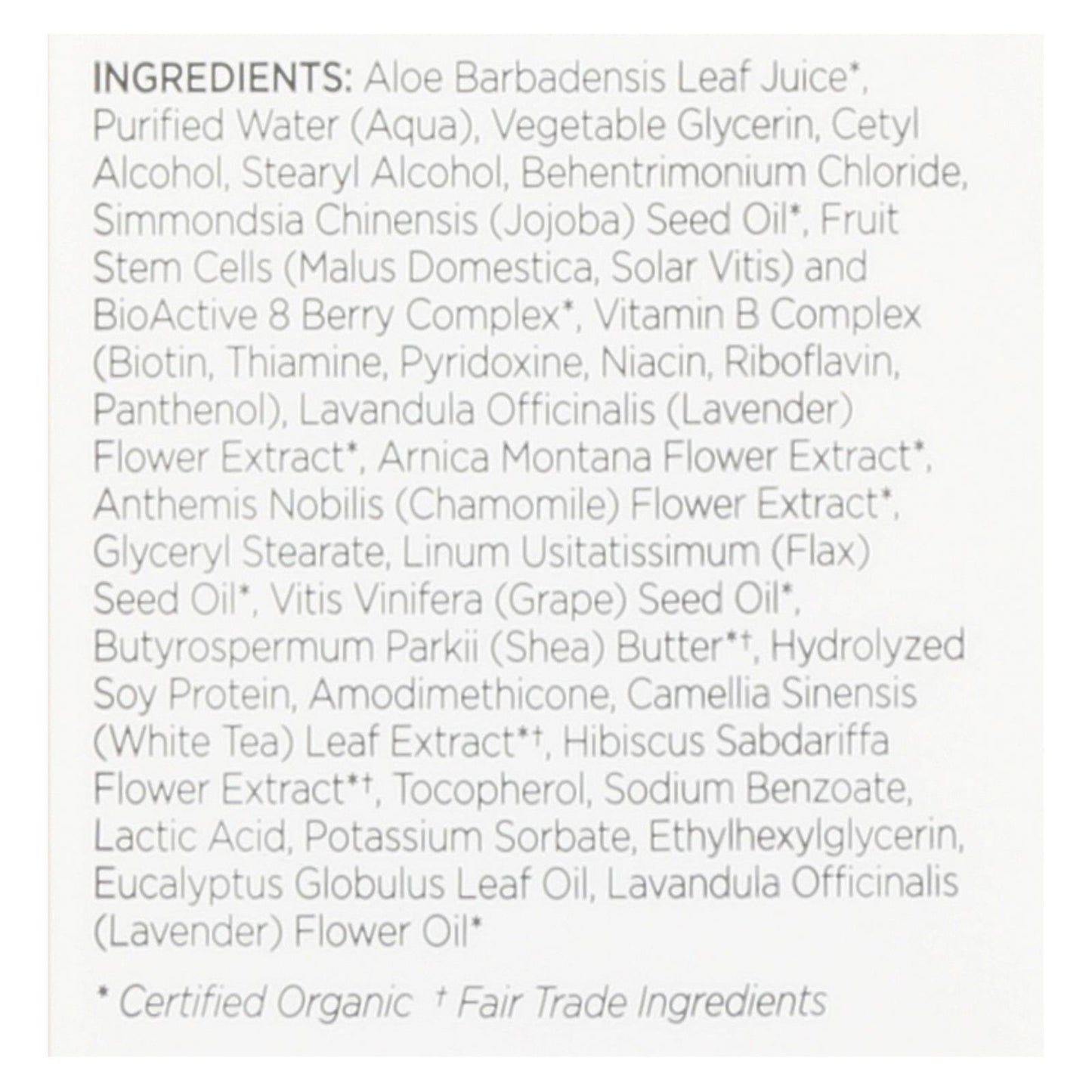 ingredients : aloe barbadensis leaf juice;purified water;aqua;vegetable glycerin;cetyl alcohol;stearyl alcohol;behentrimonium chloride;simmondsia chinensis;jojoba;seed oil;fruit stem cells;malus domestica;solar vitis;and bioactive 8 berry complex;vitamin b complex;biotin;thiamine;pyridoxine;niacin;riboflavin;panthenol;lavandula officinalis;lavender;flower extract;arnica montana flower extract;anthemis nobilis;chamomile;glyceryl stearate;linum usitatissimum;flax;vitis vinifera;grape;butyrospermum parkii;shea;b