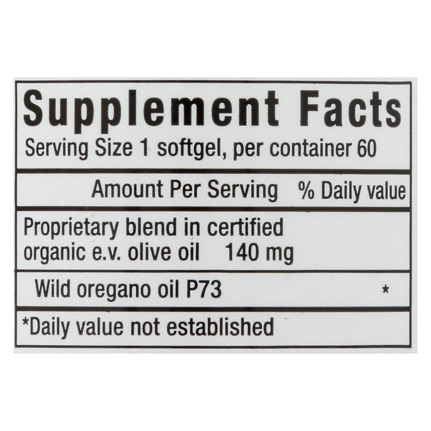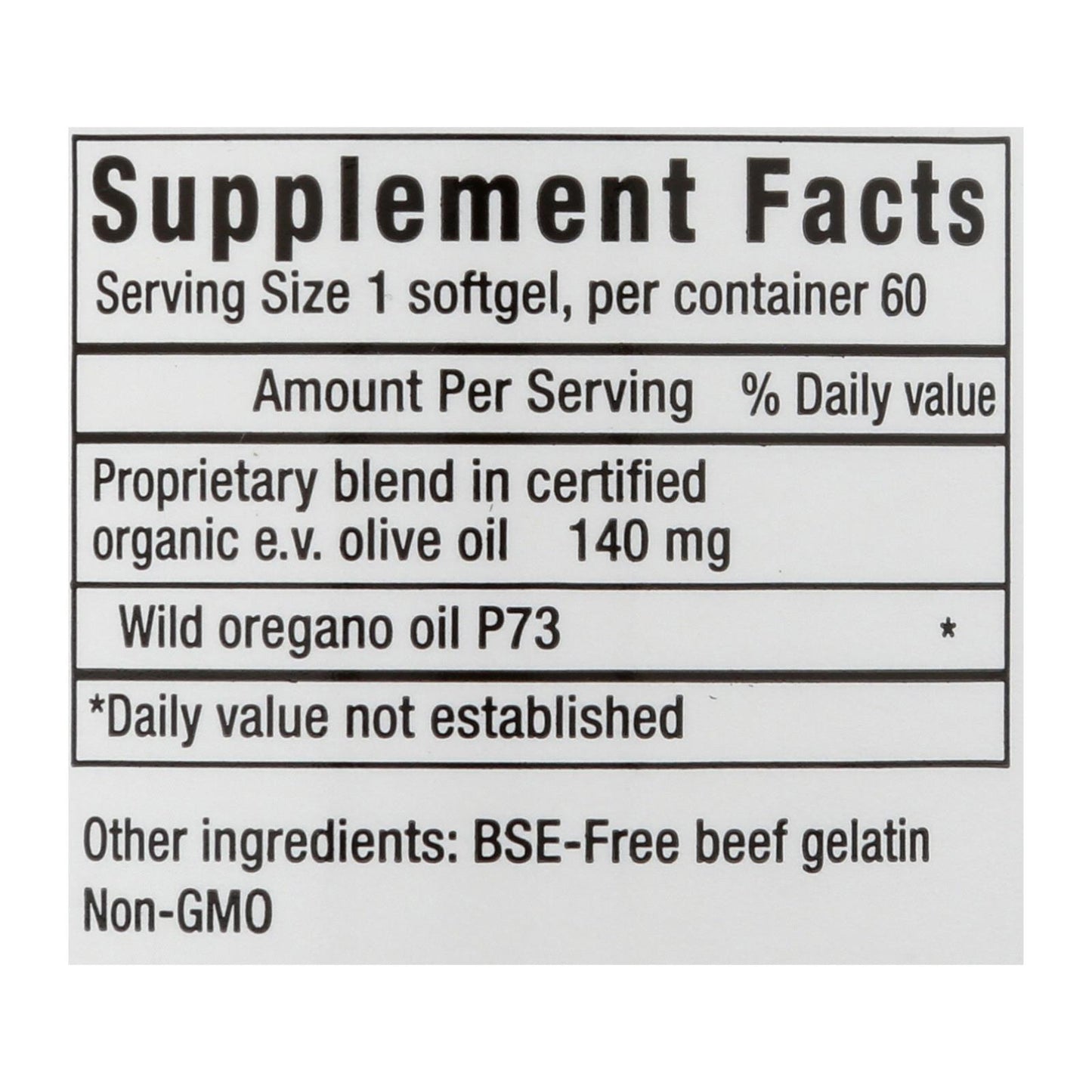Dietary Supplement. Oil of wild oregano. Wild Mediterranean handpicked. Guaranteed wild non-GMO. NAH&S was the first to develop an edible oregano oil blend - all others are imitations. Oreganol P73 Super Strength is made from the original wild, high-mountain Mediterranean oregano. It is handpicked from remote, pristine regions which are pollution and pesticide free. Oreganol P73 Super Strength is more powerful (increased wild oregano oil per mg weight) than regular strength. Softgels made from 100% beef gelatin (BSE free) non-GMO. www.oreganol.com. (These statements have not been evaluated by the Food and Drug Administration. This product is not intended to diagnose, treat, cure, or prevent any disease.)