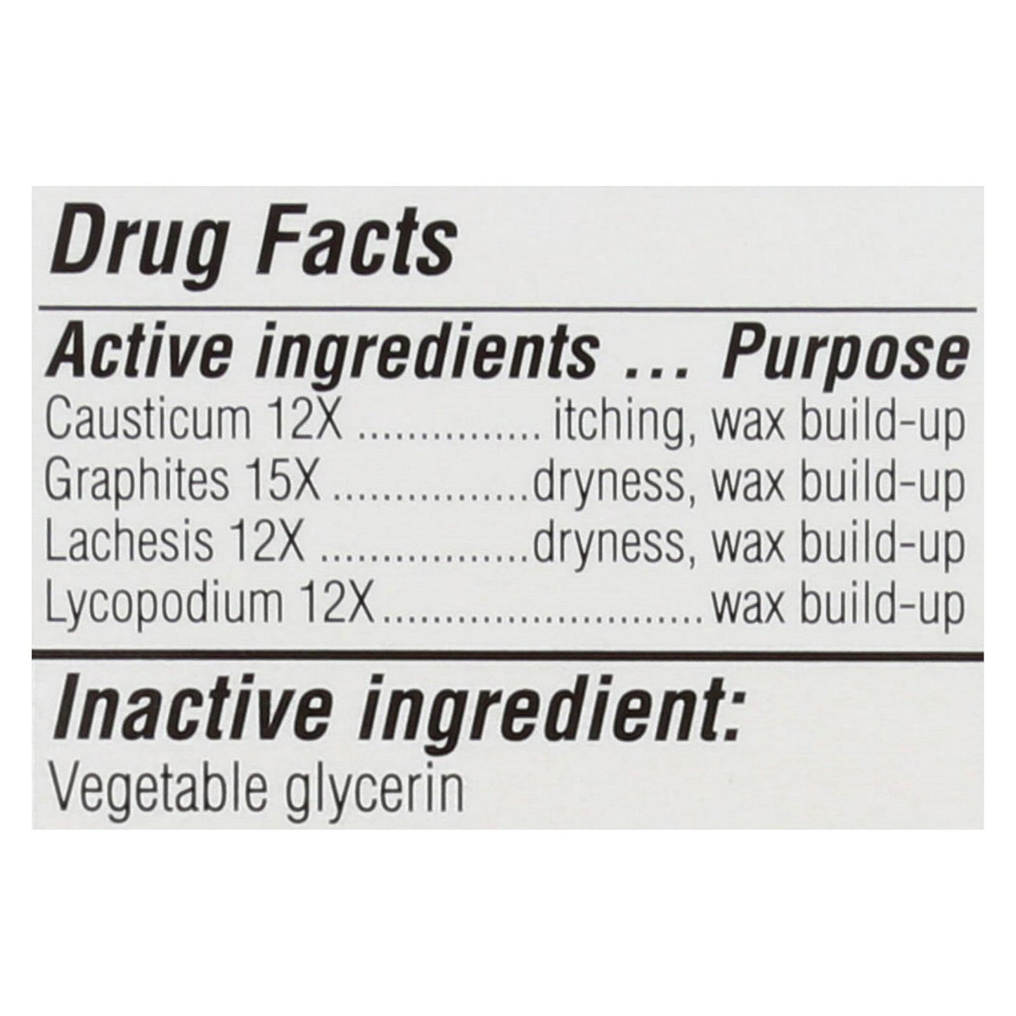 ingredients : active causticum 12x purpose itching;wax build-up graphites 15x purpose dryness;wax build-up lachesis 12x purpose dryness;wax build-up lycopodium 12x purpose wax build-up inactive ingredient: vegetable glycerin