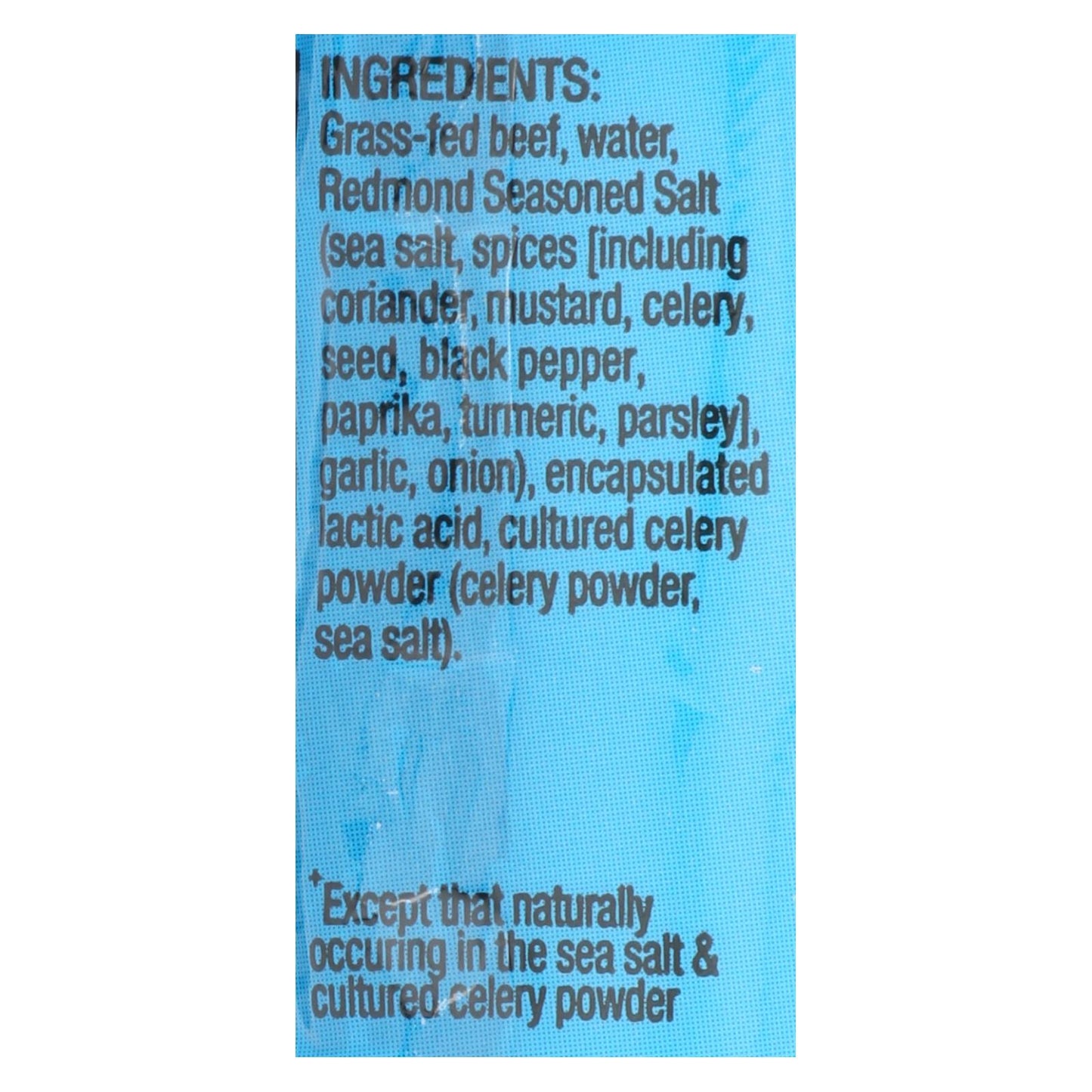 ingredients : grass-fed beef;water;redmond seasoned salt (sea salt, spices [including coriander, mustard, celery seed, black pepper, paprika, turmeric, parsley], garlic, onion);encapsulated lactic acid;cultured celery powder (celery powder, sea salt)