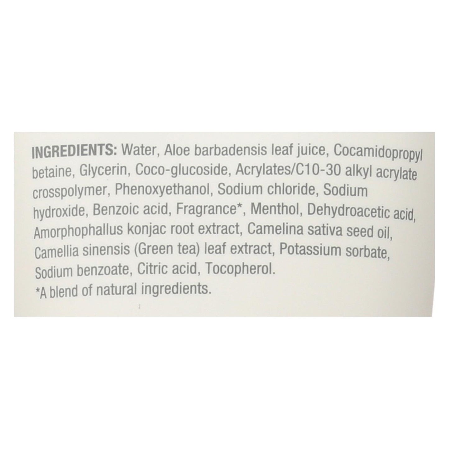 ingredients : water;aloe barbadensis leaf juice;cocamidopropyl betaine;glycerin;coco-glucoside;acrylates/c10-30 alkyl acrylate crosspolymer;phenoxyethanol;sodium chloride;sodium hydroxide;benzoic acid;fragrance;menthol;dehydroacetic acid;amorphophallus konjac root extract;camelina sativa seed oil;camellia sinensis;green tea;leaf extract;potassium sorbate;sodium benzoate;citric acid;tocopherol