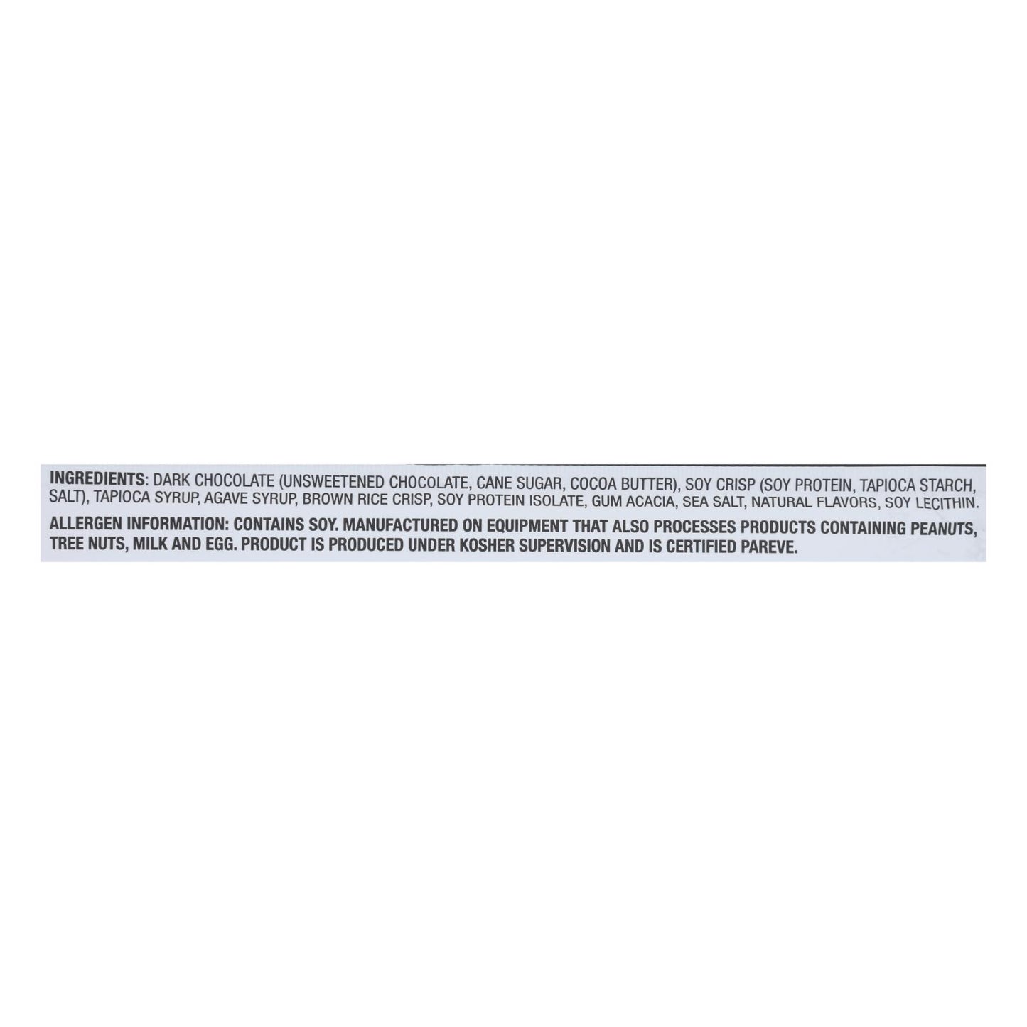 ingredients : dark chocolate (unsweetened chocolate, cane sugar, cocoa butter);soy crisp (soy protein, tapioca starch, salt);tapioca syrup;agave syrup;brown rice crisp;soy protein;gum acacia;sea salt;natural flavors;soy lecithin