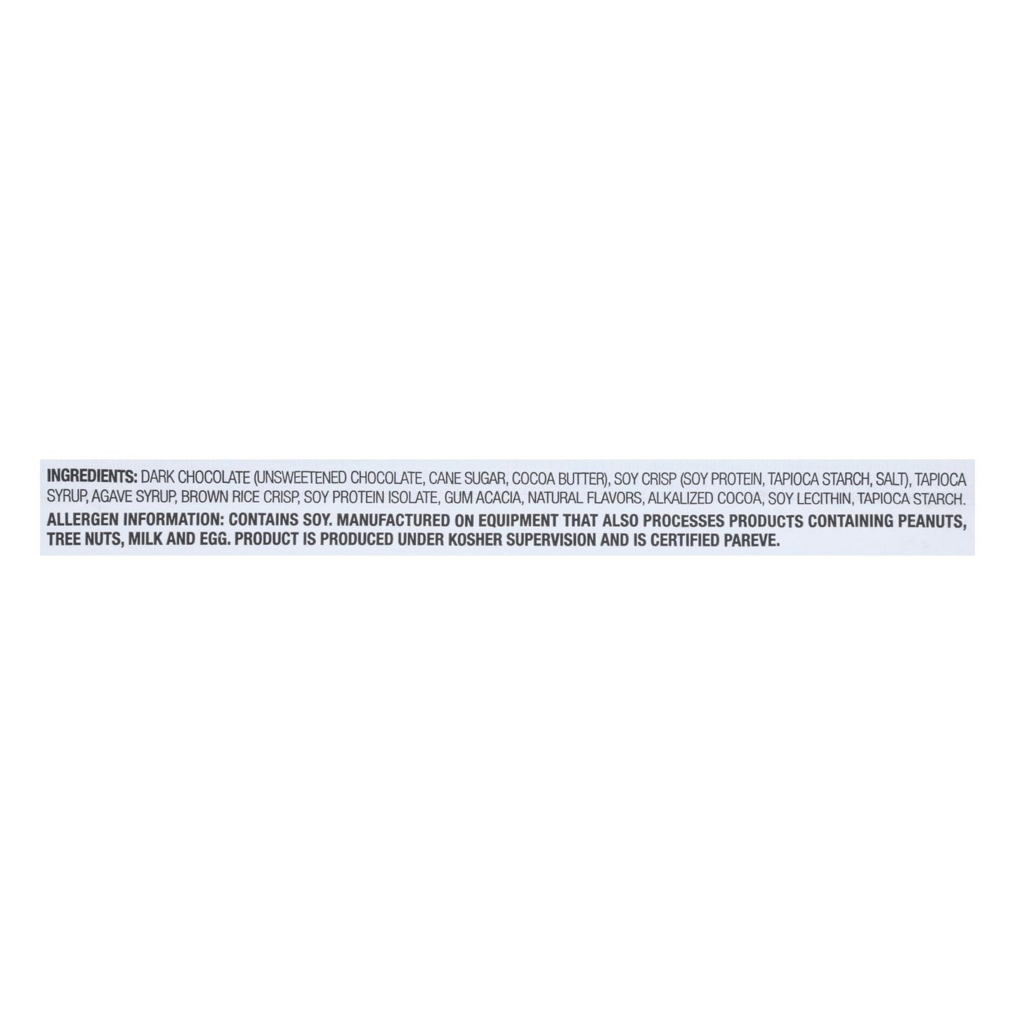 ingredients : dark chocolate (unsweetened chocolate, cane sugar, cocoa butter);soy crisp (soy protein, tapioca starch, salt);tapioca syrup;agave syrup;brown rice crisp;soy protein;gum acacia;natural flavors;alkalized cocoa;soy lecithin;tapioca starch