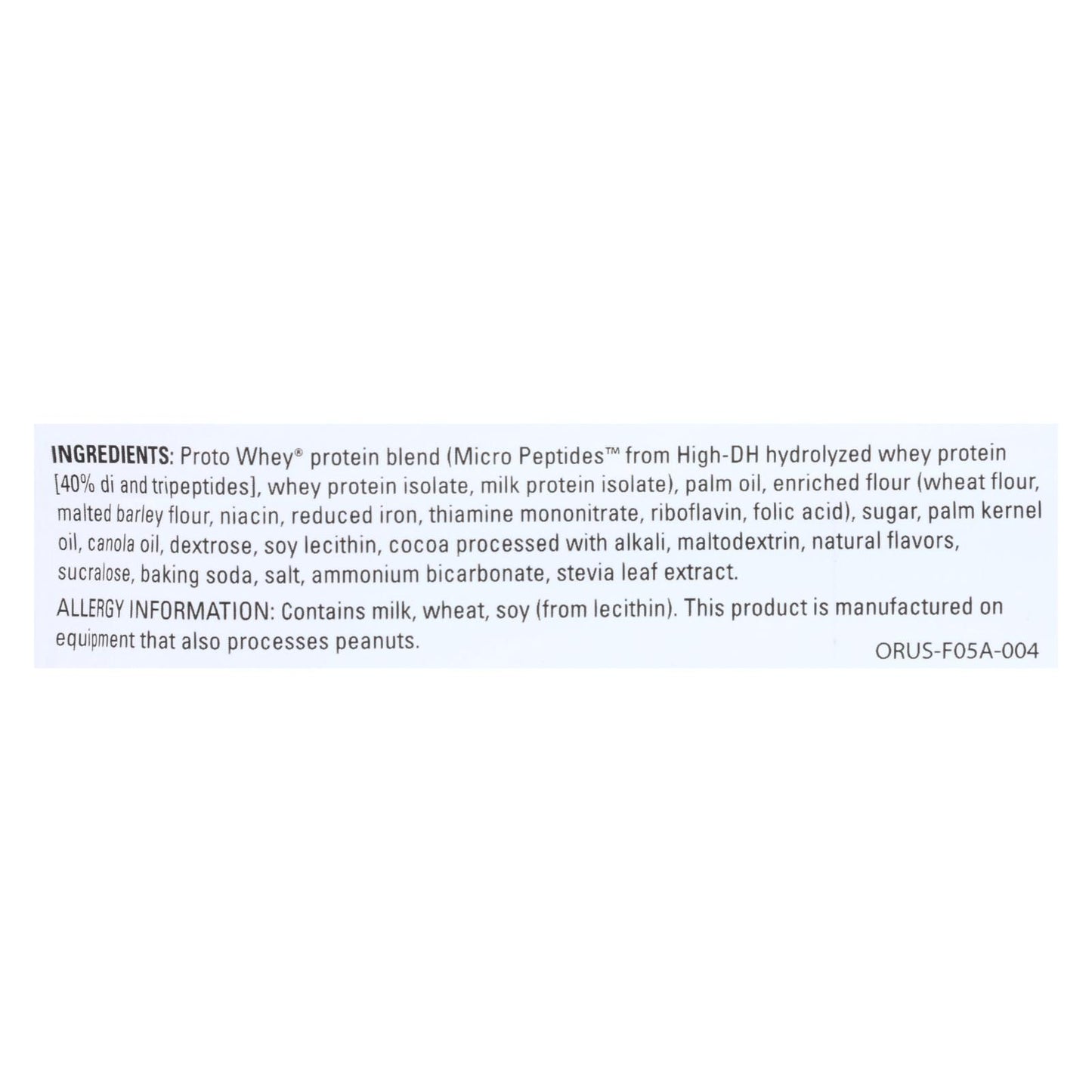ingredients : proto whey® protein blend;micro peptides™ from high-dh hydrolyzed whey protein {40% di and tripeptides};whey protein isolate;milk protein isolate;palm oil;enriched flour;wheat flour;malted barley flour;niacin;reduced iron;thiamine mononitrate;riboflavin;folic acid;sugar;palm kernel oil;canola oil;dextrose;soy lecithin;cocoa processed with alkali;maltodextrin;natural flavors;sucralose;baking soda;salt;ammonium bicarbonate;stevia leaf extract