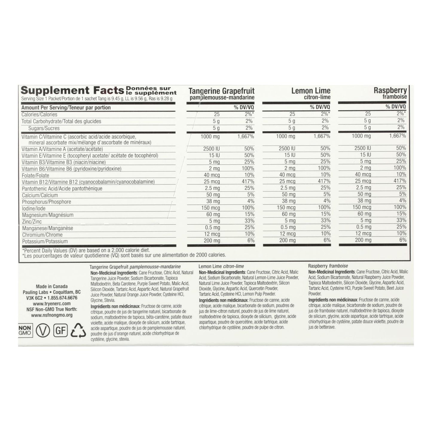 ingredients : lemon lime cane fructose;citric acid;malic acid;sodium bicarbonate;natural lemon-lime juice powder;natural lime juice powder;tapioca maltodextrin;silicon dioxide;glycine;aspartic acid;quercetin powder;tartaric acid;cysteine hci;lemon pulp powder;raspberry cane fructose;natural raspberry juice powder;purple sweet potato;beet juice powder;tangerine grapefruit cane fructose;natural tangerine juice powder;beta carotene;natural grapefruit juice powder;natural orange juice powder;stevia
