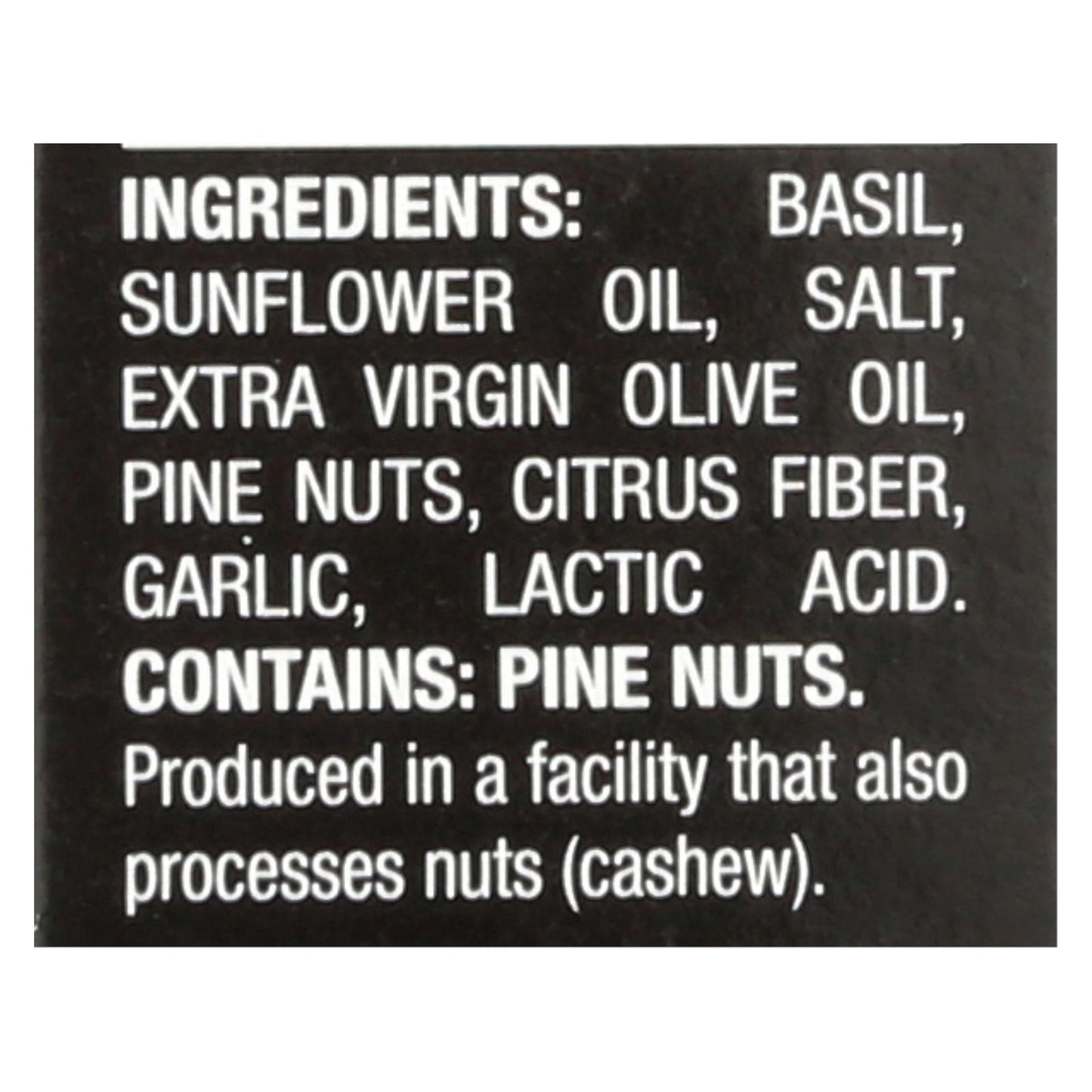 ingredients : basil sunflower oil;salt;extra virgin olive oil;pine nuts;citrus fiber;garlic;lactic acid