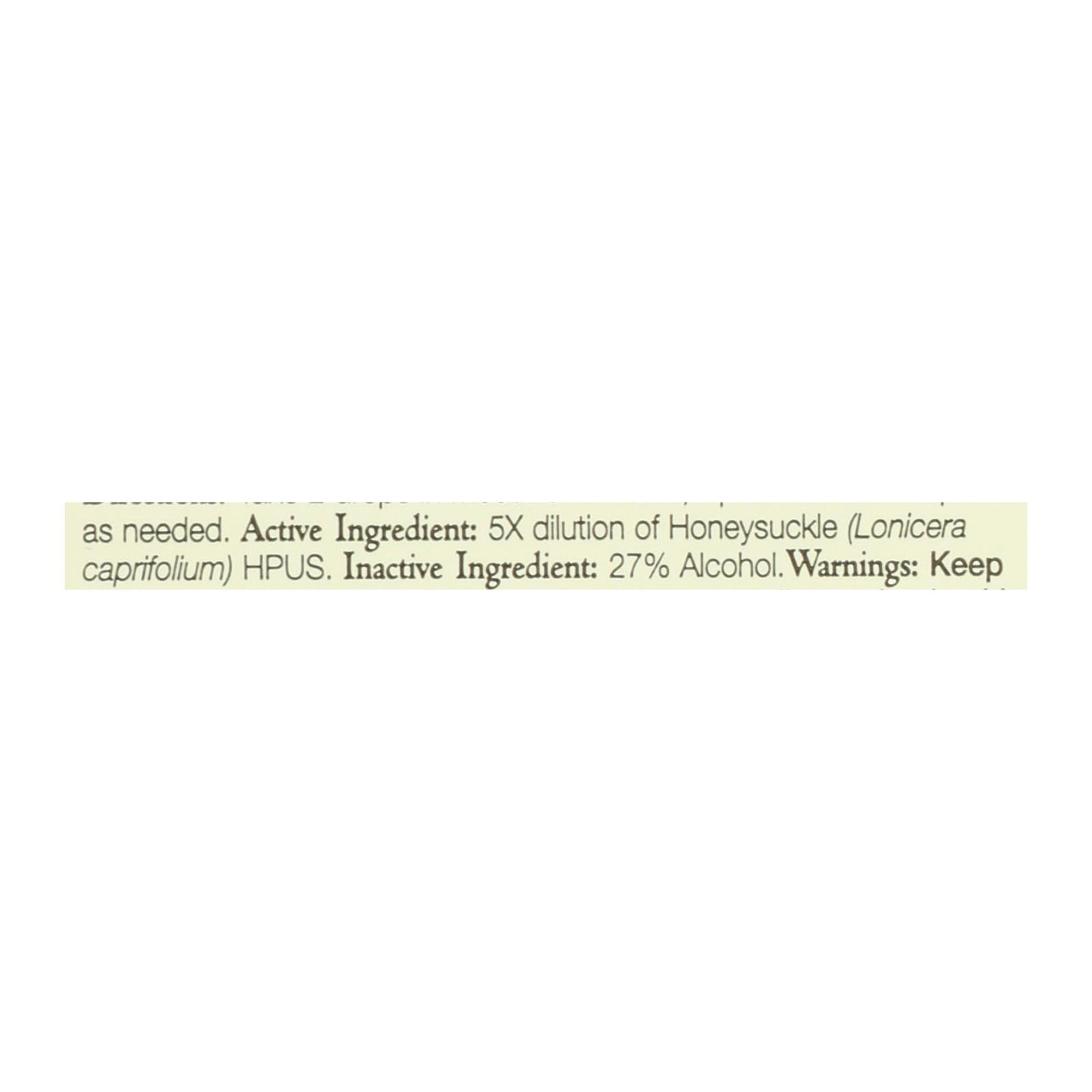 ingredients : 5x dilution of honeysuckle;lonicera caprifolium;hpus. 27% alcohol