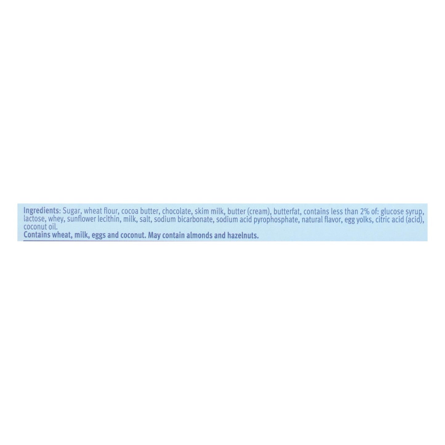 ingredients : sugar;wheat flour;cocoa butter;chocolate;skim milk;butter (cream);butterfat;contains less than 2% of: glucose syrup, lactose, whey, sunflower lecithin, milk, salt, sodium bicarbonate, sodium acid pyrophosphate, natural flavor, egg yolks, citric acid (acid), coconut oil