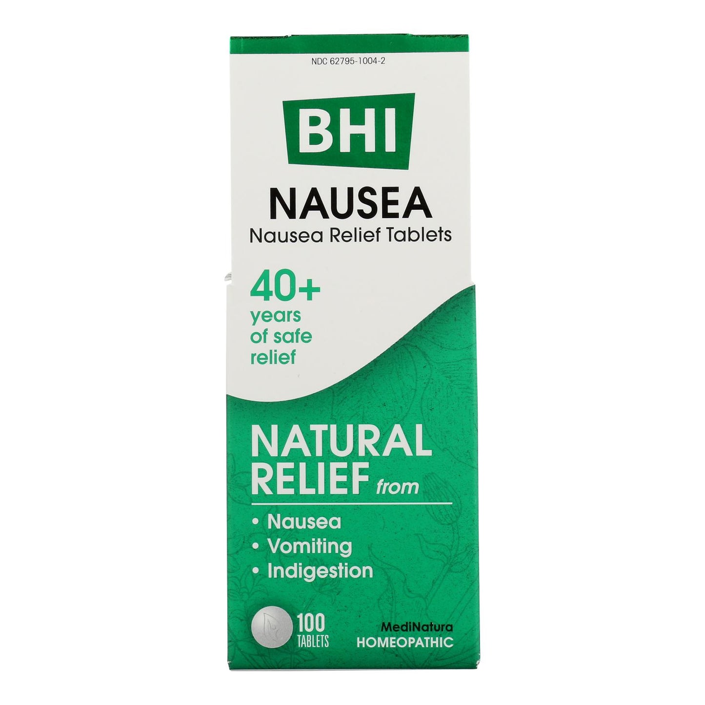 BHI HOMEOPATHIC NAUSEA RELIEF TABLETS OFFERS TEMPORARY RELIEF FOR MINOR NAUSEA, VOMITING AND INDIGESTION. OUR HOMEOPATHIC FORMULA RELIES ON THE POWER OF NATURAL INGREDIENTS, INCLUDING ANACARDIUM ORIENTALE 6X AND ARGENTUM NITRICUM 8X, TO SOOTHE MINOR DISCOMFORTS OF THE DIGESTIVE TRACT. THIS BOTTLE CONTAINS 100 TABLETS.