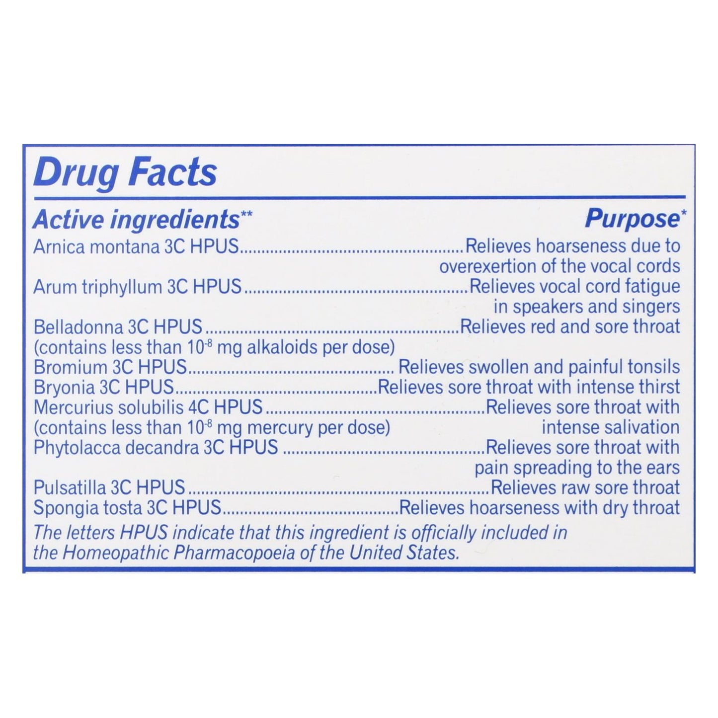 ingredients : arnica montana 3c hpus relieves hoarseness due to overexertion of the vocal cords arum triphyllum 3c hpus relieves vocal cord fatigue in speakers and singers belladonna 3c hpus relieves red and sore throat;contains less than 10^-8 mg alkaloids per dose;bromium 3c hpus relieves swollen and painful tonsils bryonia 3c hpus relieves sore throat with intense thirst mercurius solubilis 4c hpus relieves sore throat with;contains less than 10^-8 mg mercury per dose;intense salivation phytolacca decandra