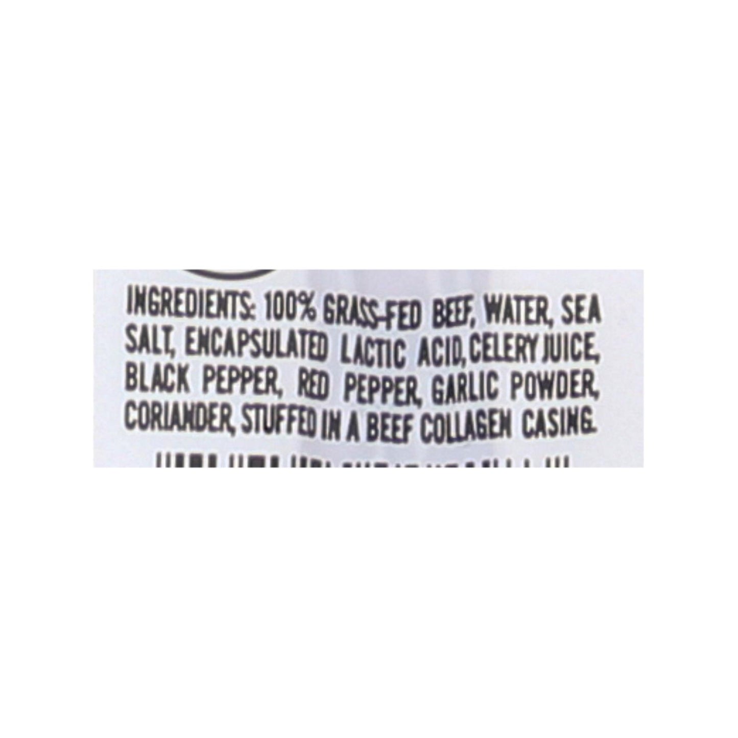 ingredients : grass fed & finished beef;water;sea salt;encapsulated lactic acid;cultured celery powder (celery powder, sea salt);black pepper;red pepper;garlic powder;coriander;stuffed in a beef collagen casing