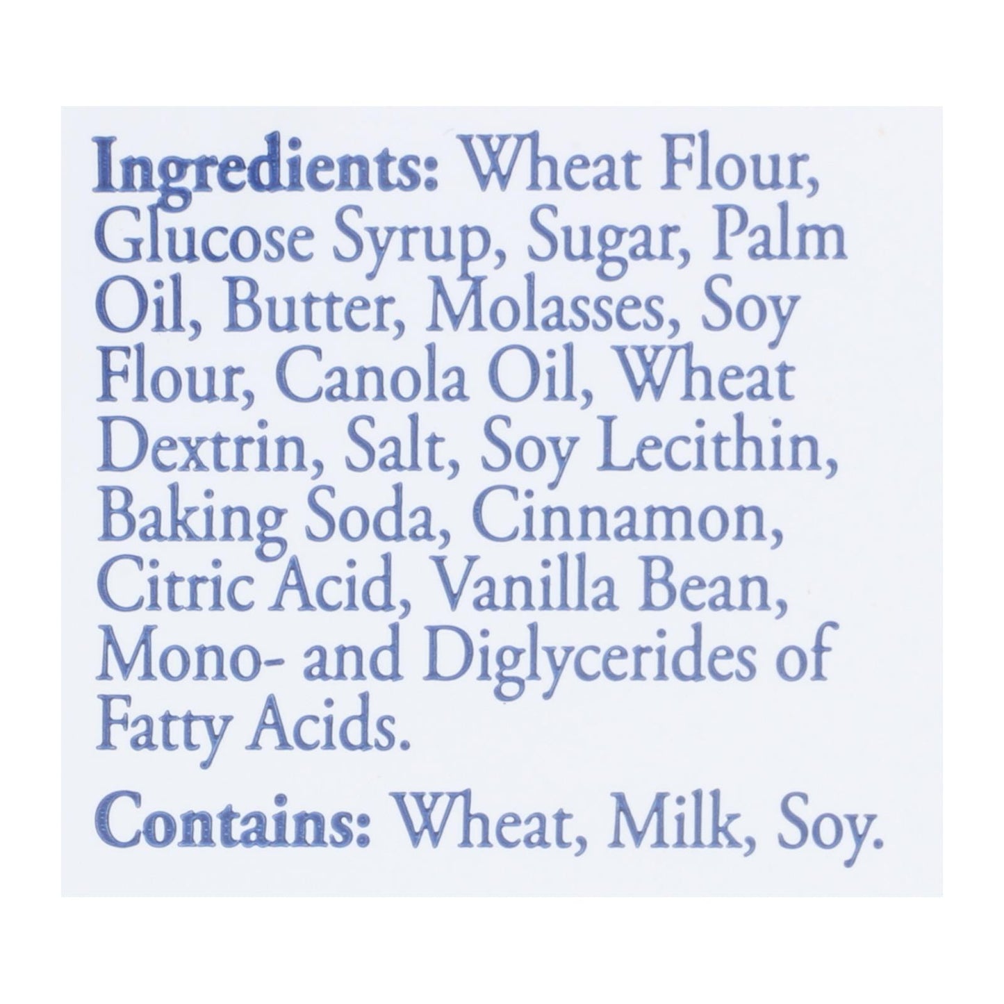 ingredients : wheat flour;glucose syrup;sugar;palm oil;butter;molasses;soy flour;canola oil;wheat dextrin;salt;soy lecithin;baking soda;cinnamon;citric acid;vanilla bean;mono- and diglycerides of fatty acids