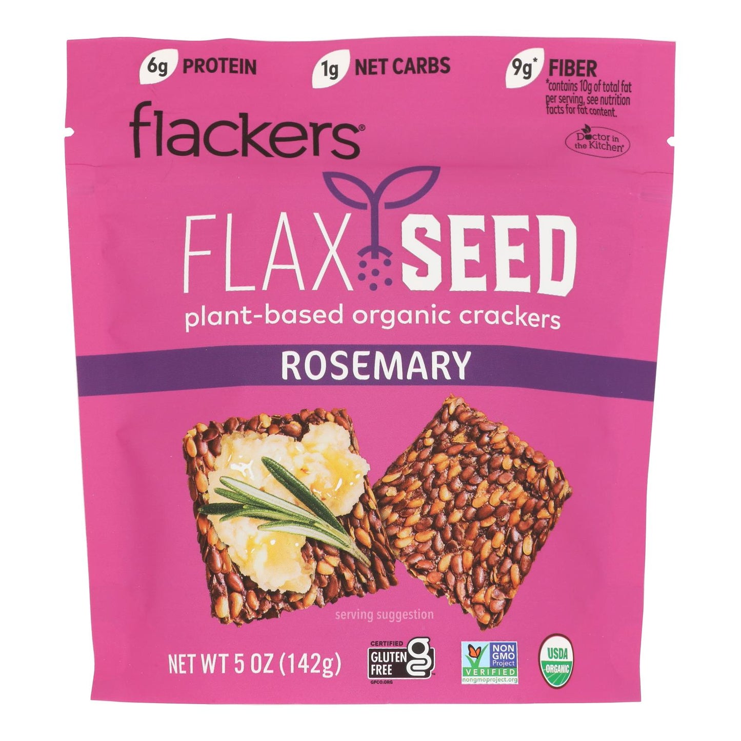 FLACKER’S ROSEMARY ORGANIC FLAX SEED CRACKERS ARE A LIGHT, NATURAL SNACK, MADE FROM ORGANIC FLAX SEEDS AND OTHER NATURAL INGREDIENTS. FLAVORED WITH ORGANIC ROSEMARY AND SAGE, FLACKER’S ORGANIC FLAX SEED CRACKERS ARE FREE FROM HARMFUL OR UNNECESSARY ADDITIVES. WITH 6 GRAMS OF FIBER AND 4 GRAMS OF PROTEIN PER SERVING, FLACKER’S ORGANIC FLAX SEED CRACKERS ARE A GREAT SNACK TO SUPPLEMENT A HEALTHY DIET. FLACKER’S ORGANIC FLAX SEED CRACKERS WITH ROSEMARY ARE KOSHER, VEGAN FRIENDLY, PALEO FRIENDLY, CERTIFIABLY NON-GMO AND GLUTEN-FREE. EACH BAG CONTAINS 5 SERVINGS, WITH 100 CALORIES PER SERVING. SEE NUTRITION FACTS PANEL FOR ALLERGENS. INCLUDES ONE 5 OZ. BAG OF FLACKER’S ROSEMARY ORGANIC FLAX SEED CRACKERS.