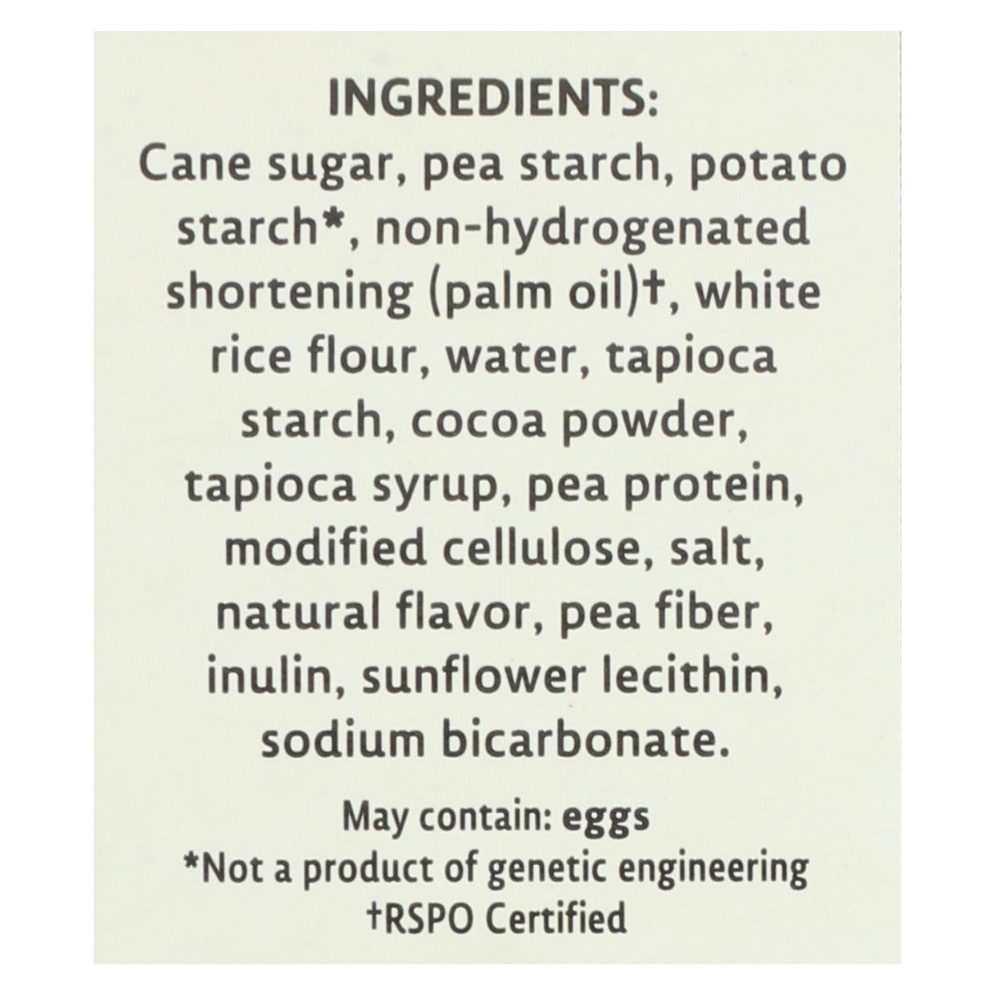 ingredients : cane sugar;pea starch;potato starch;non-hydrogenated shortening;palm oil;†;white rice flour;water;tapioca starch;cocoa powder;tapioca syrup;pea protein;modified cellulose;salt;natural flavor;pea fiber;inulin;sunflower lecithin;sodium bicarbonate