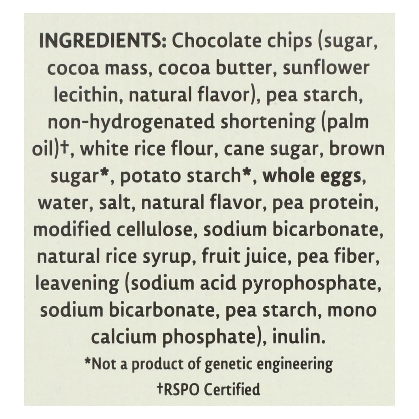 ingredients : chocolate chips;sugar;cocoa mass;cocoa butter;sunflower lecithin;natural flavor;pea starch;non-hydrogenated shortening;palm oil;†;white rice flour;cane sugar;brown sugar;potato starch;whole eggs;water;salt;pea protein;modified cellulose;sodium bicarbonate;natural rice syrup;fruit juice;pea fiber;leavening;sodium acid pyrophosphate;mono calcium phosphate;inulin