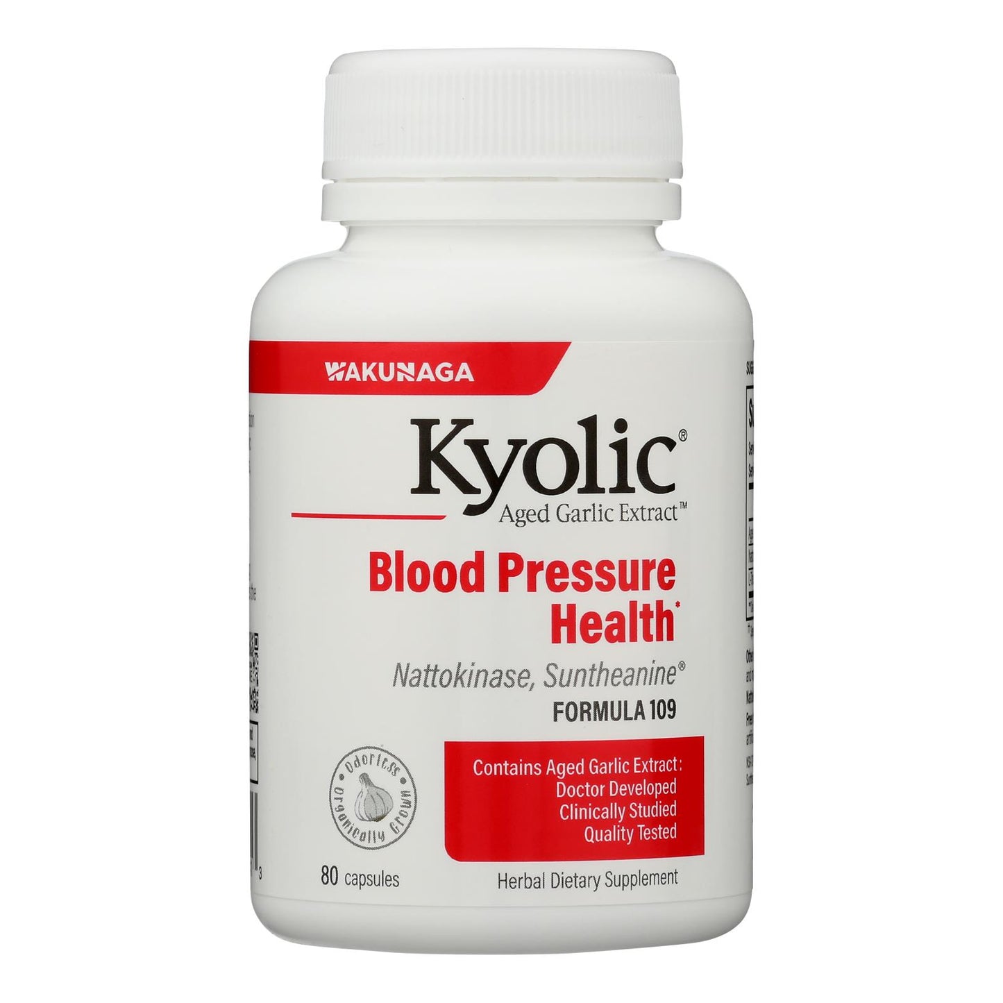 KYOLIC BLOOD PRESSURE HEALTH FORMULA 109 IS AN ODORLESS ORGANIC GARLIC SUPPLEMENT SPECIALLY FORMULATED WITH GARLIC EXTRACT, NATTOKINASE AND SUNTHEANINE TO HELP SUPPORT HEALTHY BLOOD PRESSURE. ONE BOTTLE OF KYOLIC CONTAINS 80 CAPSULES THAT ARE PRODUCED WITHOUT ANY ARTIFICIAL COLORS, FLAVORS, PRESERVATIVES OR SUGAR.