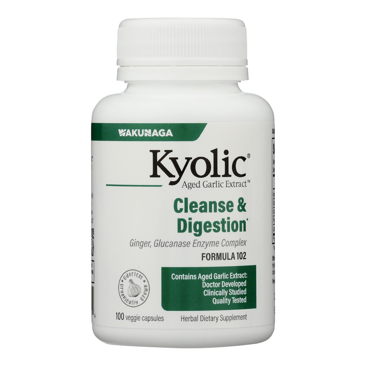 KYOLIC CANDIDA CLEANSE & DIGESTION FORMULA 102 IS AN ODORLESS ORGANIC GARLIC SUPPLEMENT SPECIALLY FORMULATED WITH GARLIC EXTRACT, GINGER AND GLUCANASE ENZYME COMPLEX TO HELP SUPPORT HEALTHY INTESTINAL FUNCTION. ONE BOTTLE OF KYOLIC CONTAINS 100 VEGETARIAN CAPSULES THAT ARE PRODUCED WITHOUT ANY ARTIFICIAL COLORS, FLAVORS, PRESERVATIVES OR SODIUM.