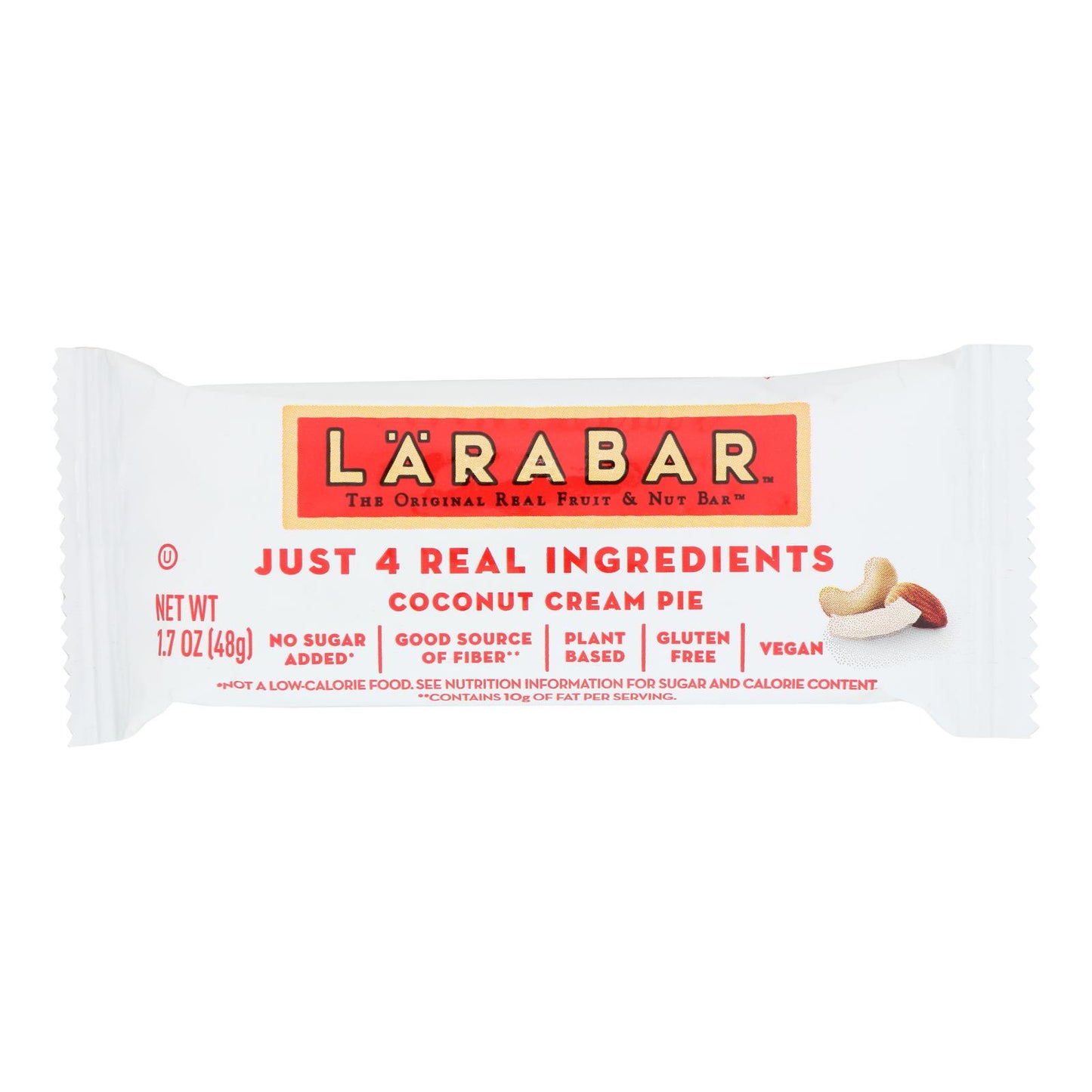 LARABAR'S COCONUT CREAM PIE BAR IS MADE WITH JUST 5 INGREDIENTS: DATES, UNSWEETENED COCONUT, ALMONDS, CASHEWS AND EXTRA VIRGIN COCONUT OIL. OUR VEGAN FRIENDLY COCONUT CREAM PIE BAR IS MADE WITH INGREDIENTS THAT ARE GMO AND GLUTEN-FREE WITH NO ADDED SUGARS. WE USE INGREDIENTS THAT ARE ORTHODOX UNION KOSHER CERTIFIED AND FREE OF CHOLESTEROL, DAIRY AND SOY. EACH BAR IS A SINGLE SERVING AND HAS NO TRANS FATS. INCLUDED IS ONE 1.7 OZ. COCONUT CREAM PIE BAR. SEE NUTRITION FACTS PANEL FOR ALLERGENS.