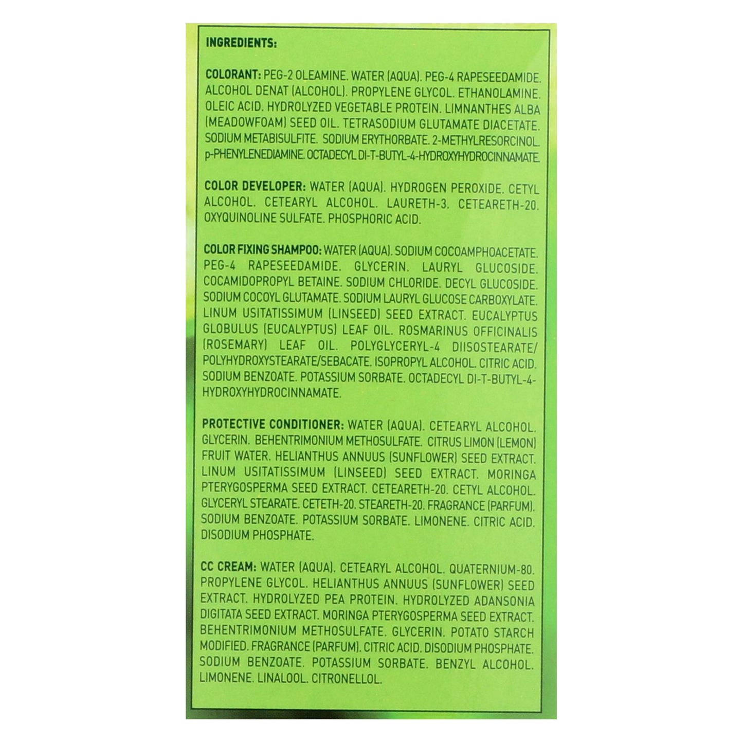 ingredients : cc cream: water;aqua;cetearyl alcohol. Quaternium-80. Propylene glycol. Helianthus annuus;sunflower;seed extract. Hydrolyzed pea protein. Hydrolyzed adansonia digitata seed extract. Moringa pterygosperma seed extract. Behentrimonium methosulfate. Glycerin. Potato starch modified. Fragrance;parfum;citric acid. Disodium phosphate. Sodium benzoate. Potassium sorbate. Benzyl alcohol. Limonene. Linalool. Citronellol;color developer: water;hydrogen peroxide. Cetyl alcohol. Cetearyl alcohol. Laureth-3.