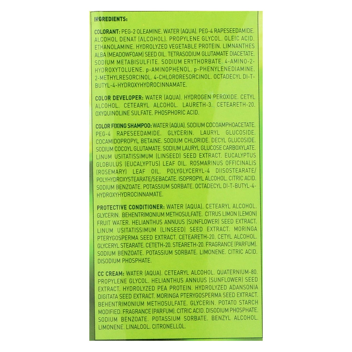 ingredients : cc cream: water;aqua;cetearyl alcohol. Quaternium-80. Propylene glycol. Helianthus annuus;sunflower;seed extract. Hydrolyzed pea protein. Hydrolyzed adansonia digitata seed extract. Moringa pterygosperma seed extract. Behentrimonium methosulfate. Glycerin. Potato starch modified. Fragrance;parfum;citric acid. Disodium phosphate. Sodium benzoate. Potassium sorbate. Benzyl alcohol. Limonene. Linalool. Citronellol;color developer: water;hydrogen peroxide. Cetyl alcohol. Cetearyl alcohol. Laureth-3.