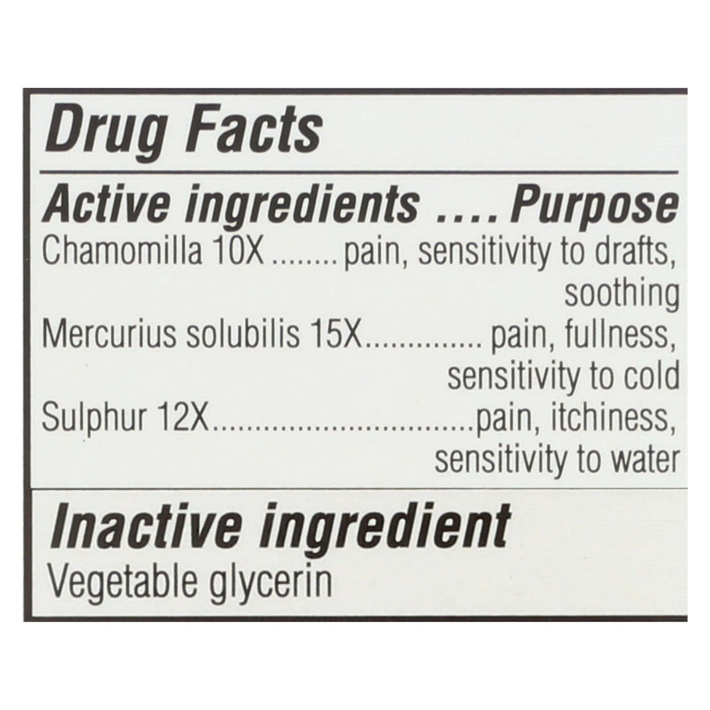 ingredients : active chamomilla 10x purpose pain;sensitivity to drafts;soothing mercurius solubilis 15x pain;fullness;sensitivity to cold sulphur 12x pain;itchiness;sensitivity to water inactive ingredient vegetable glycerin