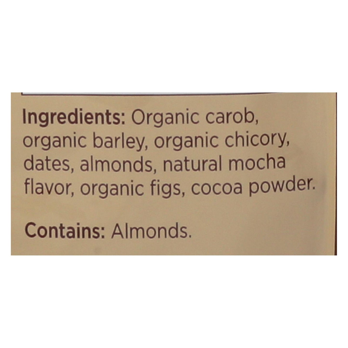ingredients : organic carob;organic barley;organic chicory;dates;almonds;natural mocha flavor;organic figs;cocoa powder