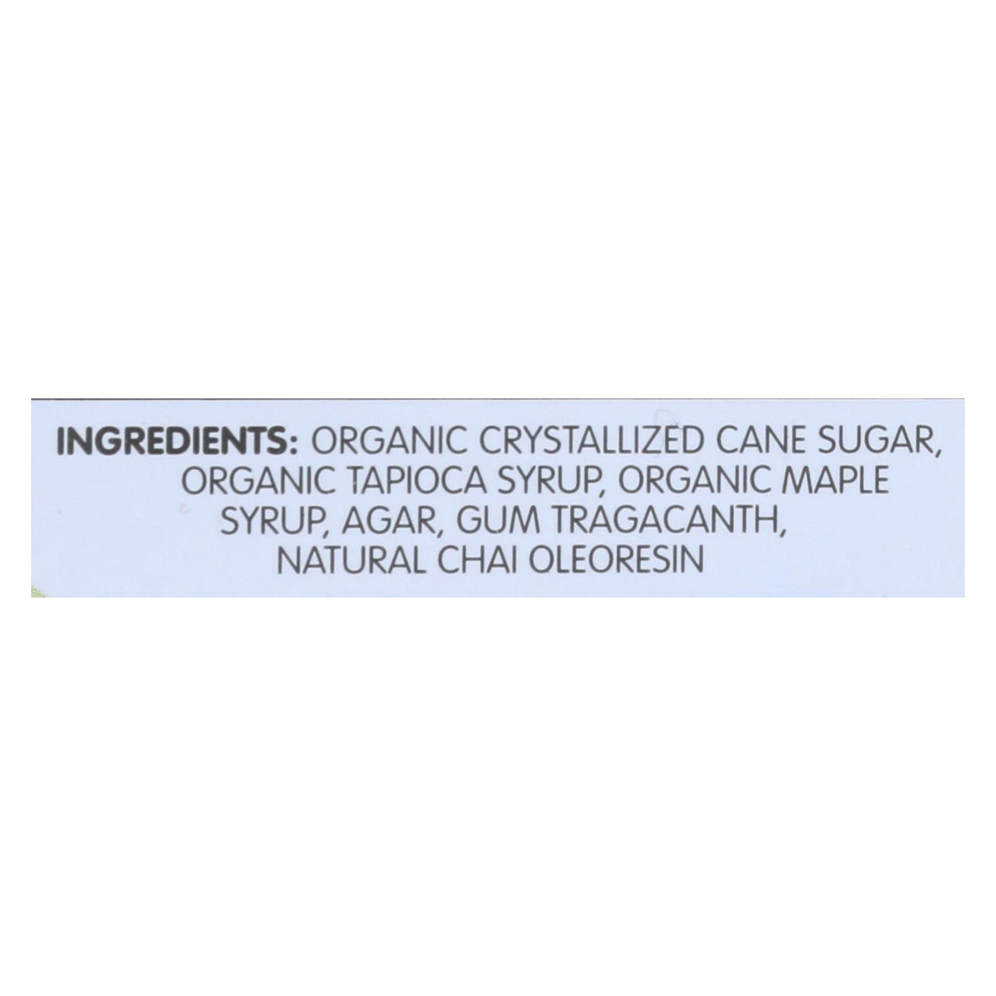 ingredients : organic crystallized cane sugar;organic tapioca syrup;organic maple syrup;agar;gum tragacanth;natural chai oleoresin