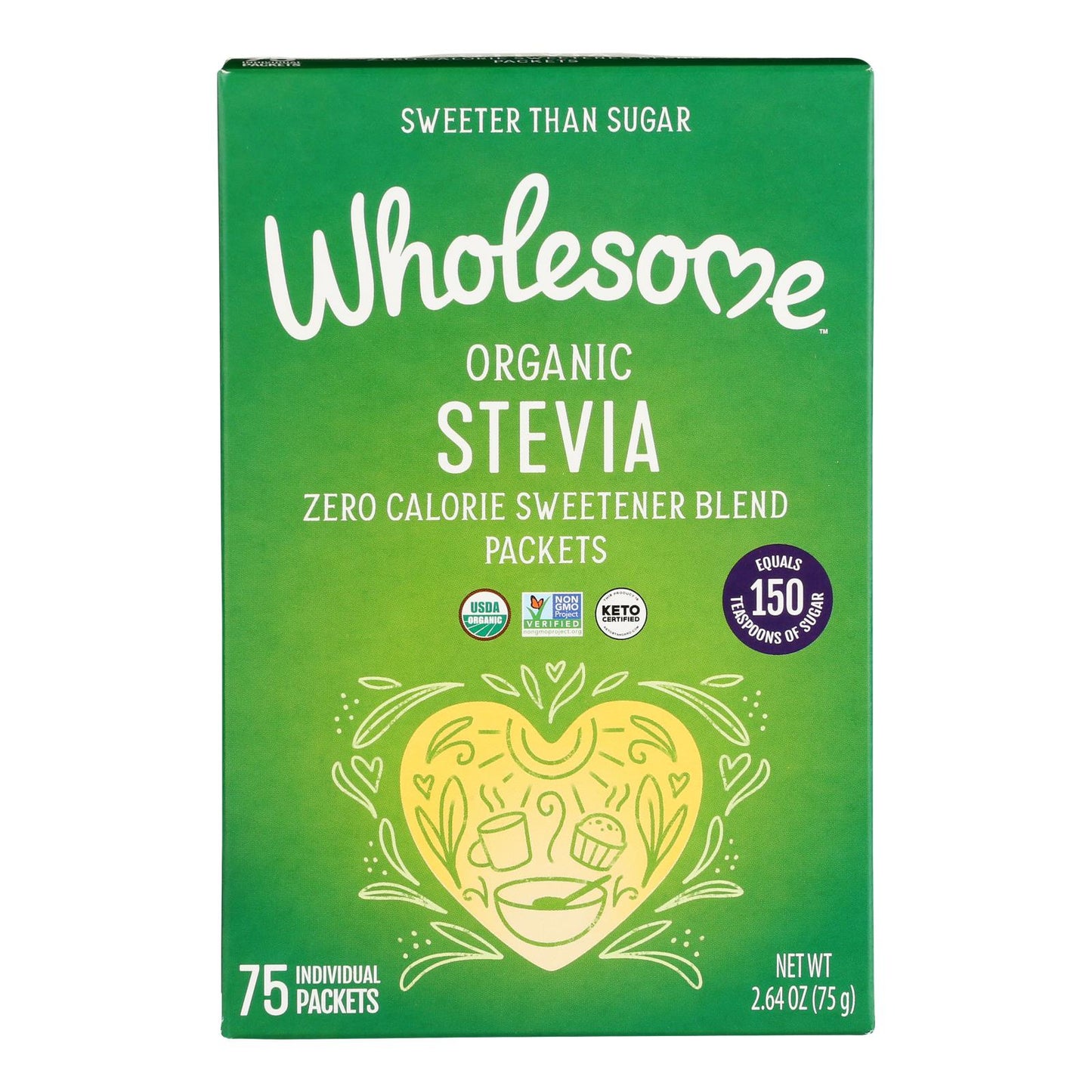 WHOLESOME! ORGANIC STEVIA ZERO CALORIE SWEETENER BLEND IS MADE FROM CERTIFIED NON-GMO INGREDIENTS. THIS SWEETENER IS LOW ON THE GLYCEMIC INDEX AND FREE OF ARTIFICIAL INGREDIENTS. ONE TEASPOON OF ORGANIC STEVIA IS EQUAL TO 2 TEASPOONS OF REGULAR SUGAR. OUR ZERO CALORIE SWEETENER IS NATURALLY GLUTEN-FREE AND VEGAN. THIS BOX HOLDS 75 INDIVIDUAL PACKETS OF ORGANIC STEVIA ZERO CALORIE SWEETENER.