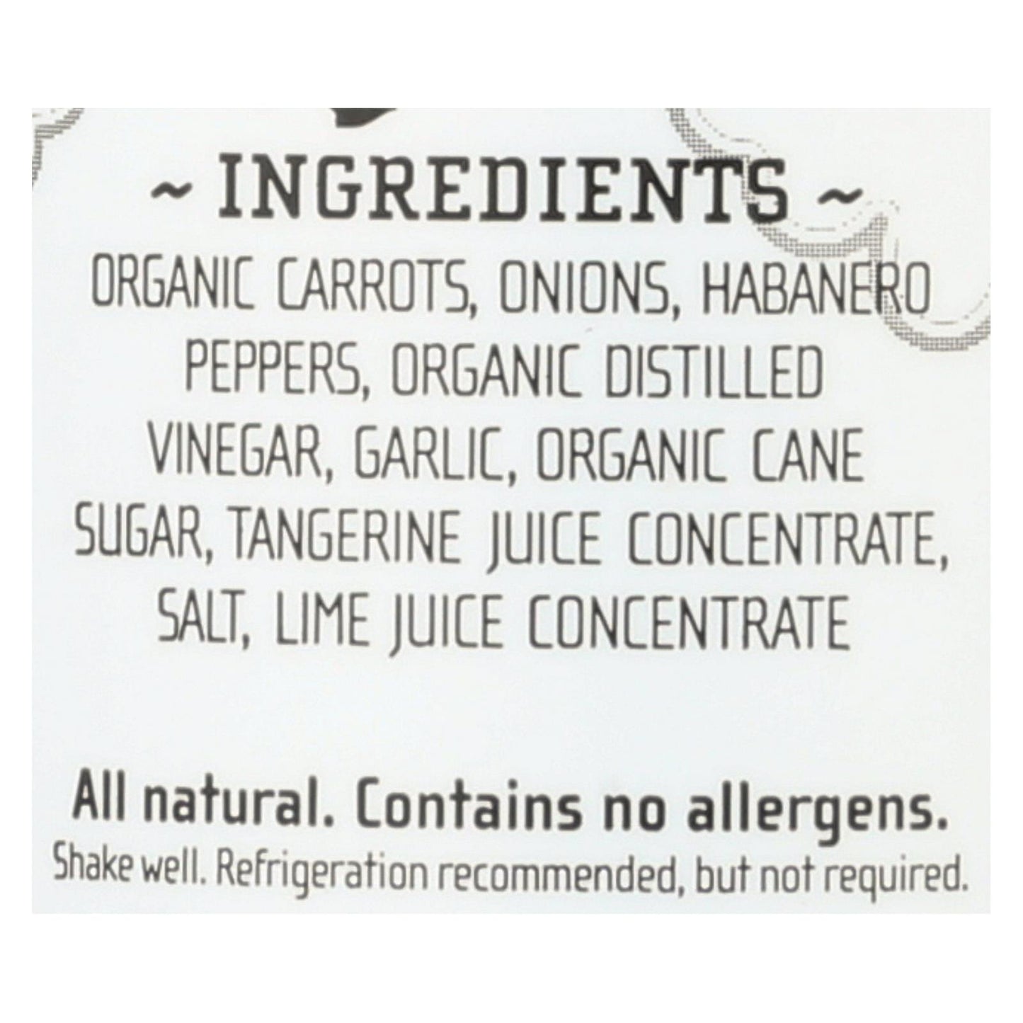 ingredients : organic carrots;onions;habanero peppers;organic distilled vinegar;garlic;organic cane sugar;tangerine juice concentrate;salt;lime juice concentrate