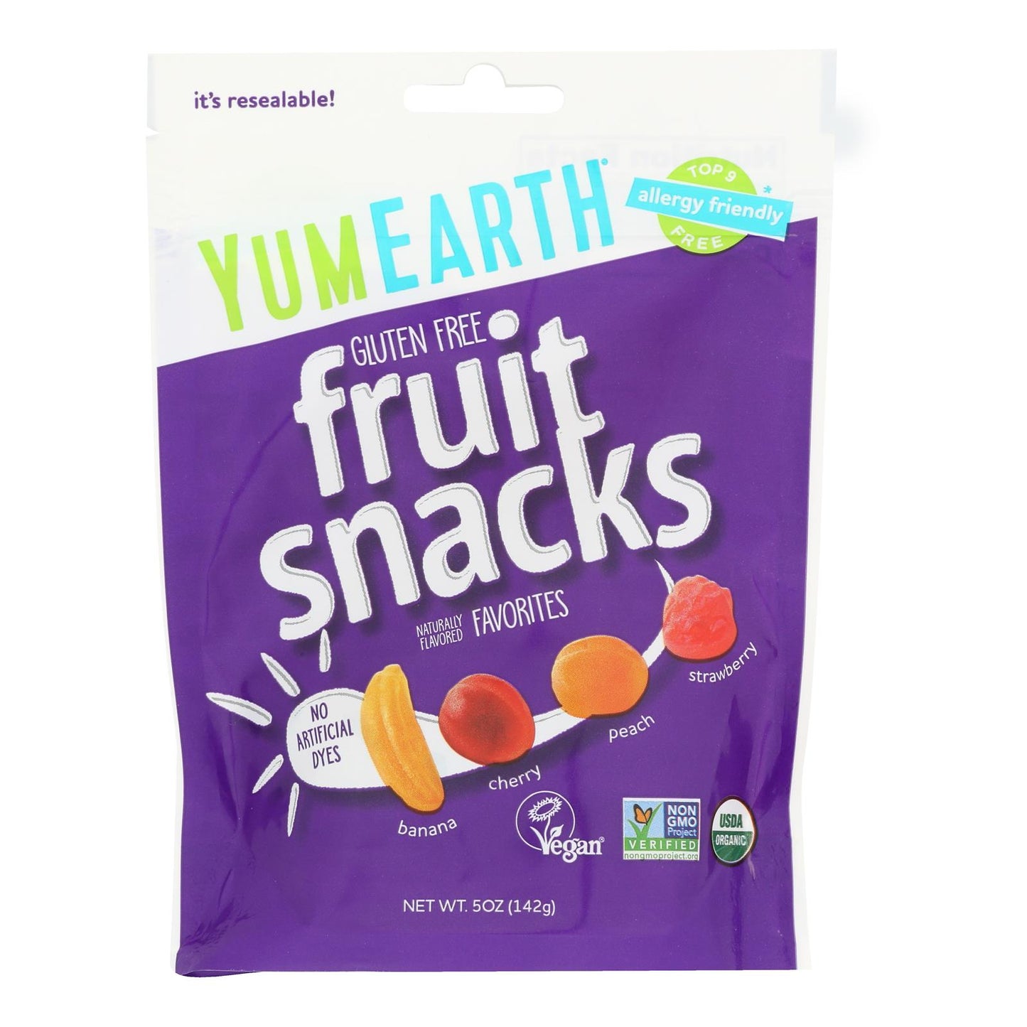 Banana blast, strawberry smash, very very cherry, perfectly peach. Gluten free. USDA Organic. Certified Organic by Ecocert France SAS. Vegan. Non GMO Project Verified. nongmoproject.org. No artificial dyes. Allergy Friendly: Safe for the classroom (Even more reasons to love them: Vegan; gluten free; organic & non-GMO; colored with real fruit & vegetable juice; manufactured & packaged in a peanut free facility; Made without: soy; egg; dairy; fish; shellfish; peanuts or tree nuts; artificial dyes; high fructose corn syrup). Since 2007, we've been making organic candy with a whole lotta love and simple ingredients you can pronounce. We offer a tasty variety of organic and allergy-friendly candy that is so delicious you will love to share (or keep all to yourself). What's not to love? yumearth.com. Scan for more! Visit yumearth.com/faqs for complete packaging and manufacturing info. Product of France.