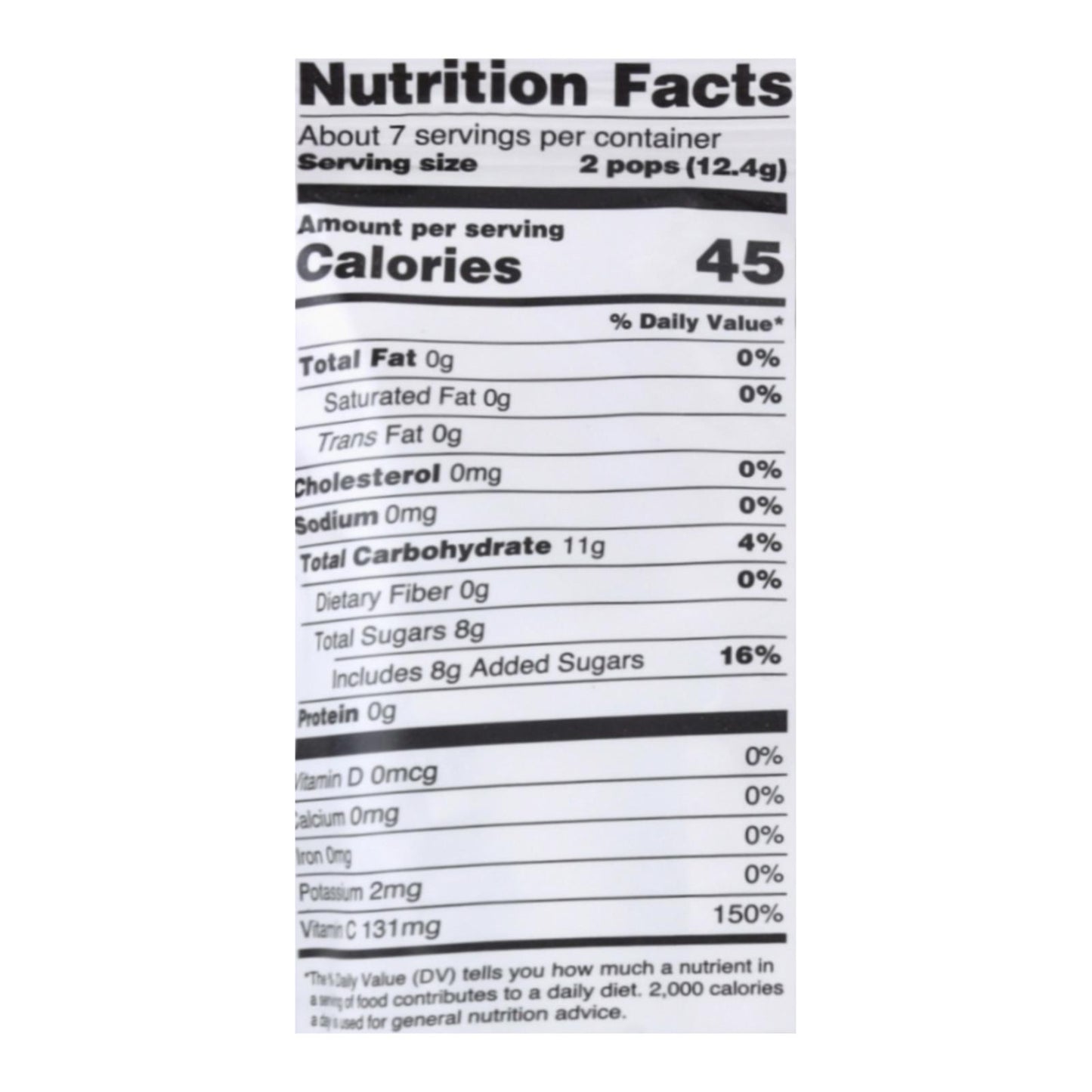 YUMEARTH VITAMIN C POPS ARE IN A PACKAGE CONTAINING 14 HARD CANDY FRUIT SNACK POPS IN 3 FUN FLAVORS: STRAWBERRY SMASH, VERY CHERRY AND RAZZMATAZZ BERRY. ALL ARE FLAVORED AND COLORED WITH REAL FRUIT JUICE, AND THERE ARE ONLY 20 CALORIES PER POP. INGREDIENTS INCLUDE ORGANIC CANE SUGAR RATHER THAN HIGH FRUCTOSE CORN SYRUP. THIS PRODUCT IS KOSHER, GLUTEN-FREE AND NON-GMO.